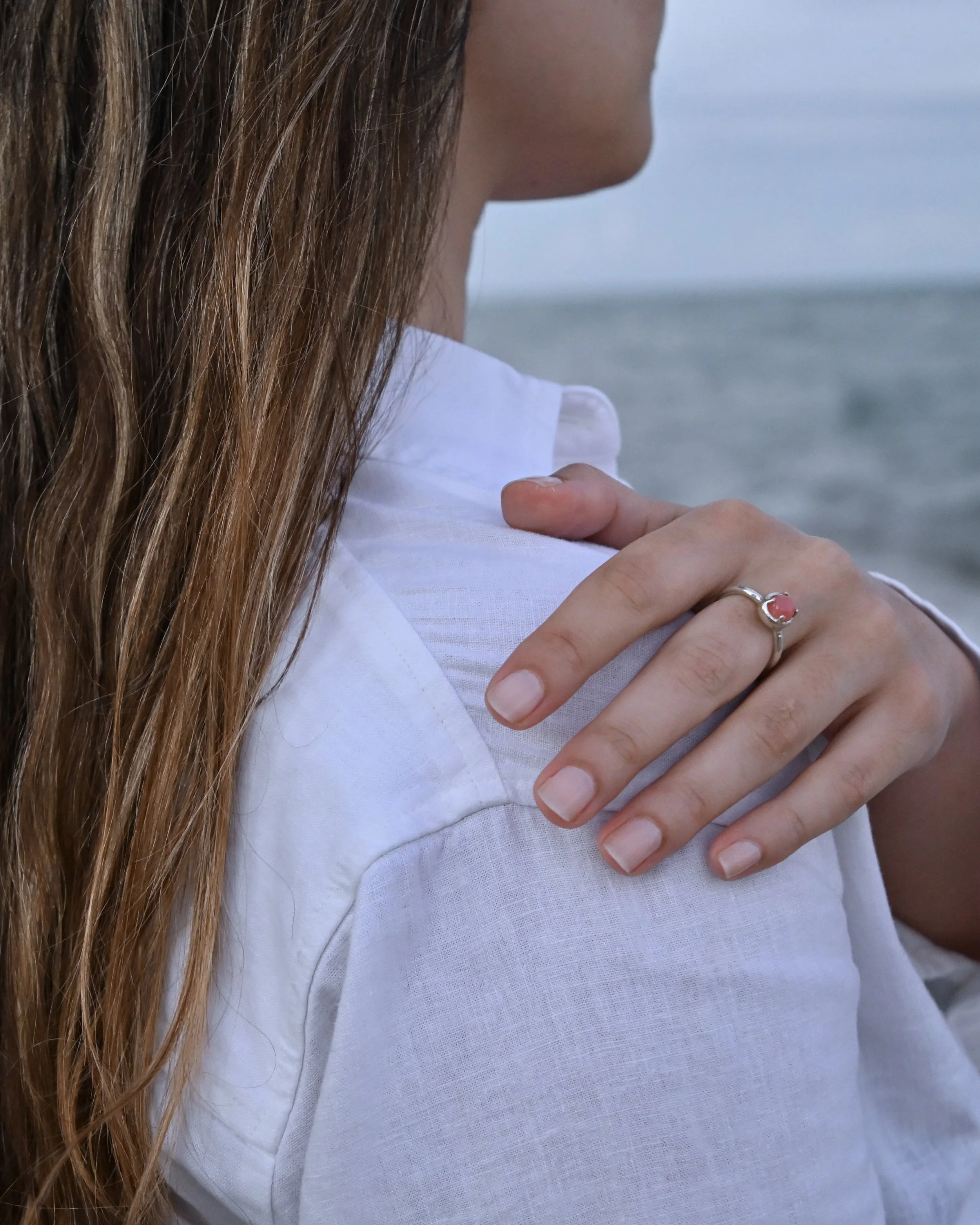 Un anillo elegante y contemporáneo que destaca por la presencia central de una Rodocrosita, piedra nacional de Argentina. La gema está tallada en cabujón para potenciar su brillo suave y su textura sedosa. El engaste es minimalista pero preciso: unas garras finas rodean la piedra, asegurando sofisticación.